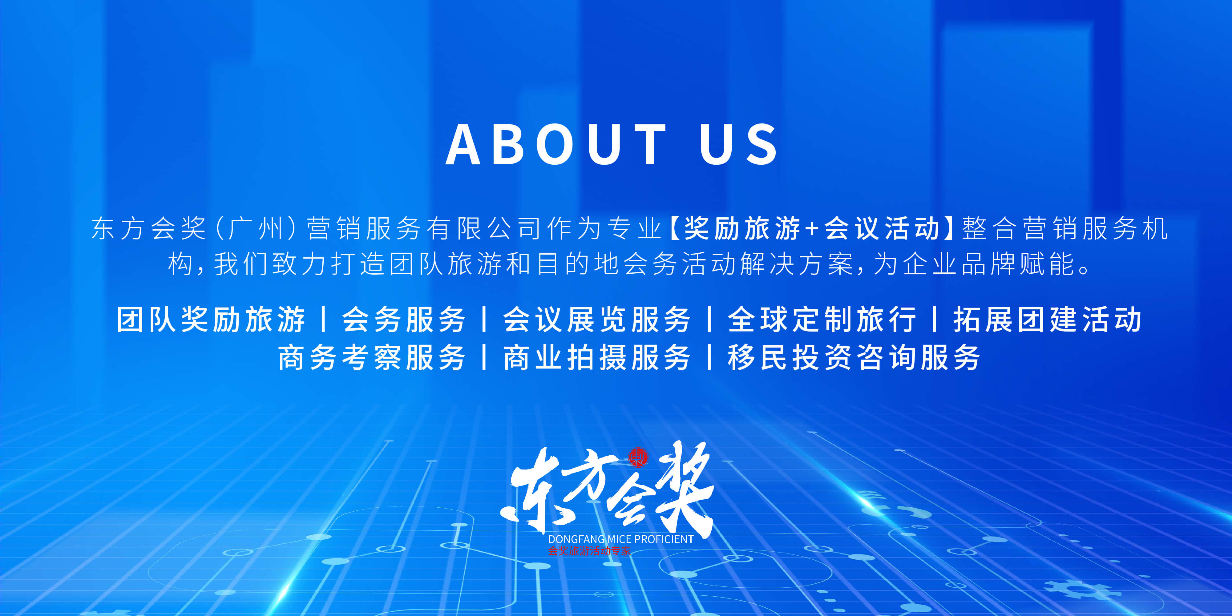 東方會獎(廣州)營銷服務(wù)有限公司 作為專業(yè)會獎旅游活動專家,我們致力打造專業(yè)團隊旅游和目的地會務(wù)會展解決方案,為企業(yè)品牌賦能。 基于對商業(yè)客戶需求的深刻理解和豐富的服務(wù)經(jīng)驗,東方會獎成功實現(xiàn)從單一服務(wù)到整合服務(wù)、從簡單服務(wù)到高附加值服務(wù)、從線下服務(wù)到覆蓋線上線下的整合營銷服務(wù)布局,旗下東方會獎、途蘭朵旅行、左契文化、途蘭朵科技、全球開拓者等各業(yè)態(tài)的專業(yè)子公司相繼成立。目前,東方會獎已經(jīng)在中國主要經(jīng)濟區(qū)域建立了完善的服務(wù)網(wǎng)絡(luò),覆蓋廣州、深圳、佛山、杭州、成都、貴陽、西安、福州、廈門、桂林、長沙等核心城市。 成立至今,東方會獎一直專注于為新零售、保險、金融、直銷等機構(gòu)客戶提供“一站式”整合營銷服務(wù),業(yè)務(wù)涵蓋:團隊獎勵旅游,目的地會務(wù)服務(wù),會議展覽服務(wù),全球定制旅行,拓展團建活動,商務(wù)考察服務(wù),專業(yè)旅行拍攝服務(wù)。為企業(yè)品牌實現(xiàn)真正的全案整合營銷。